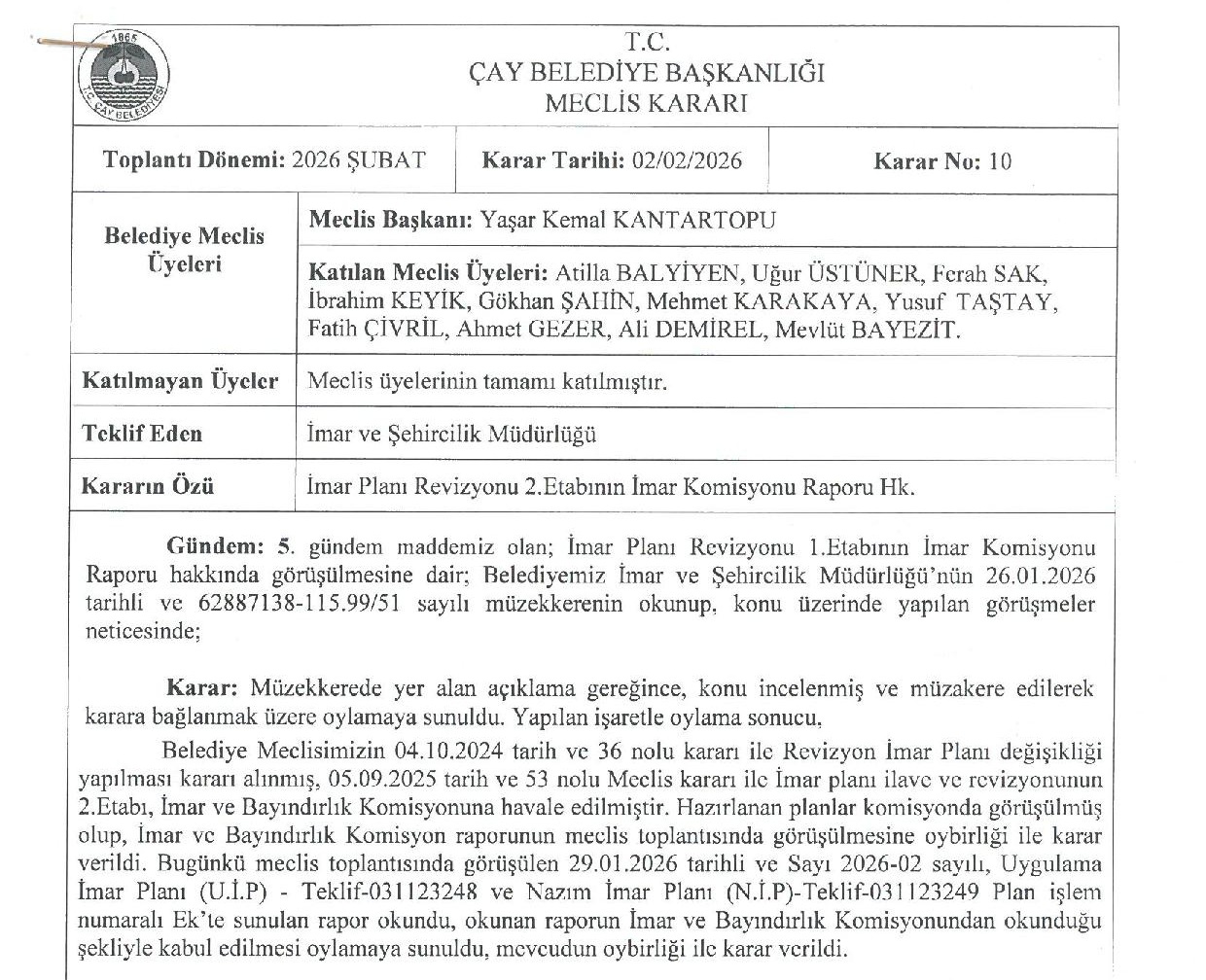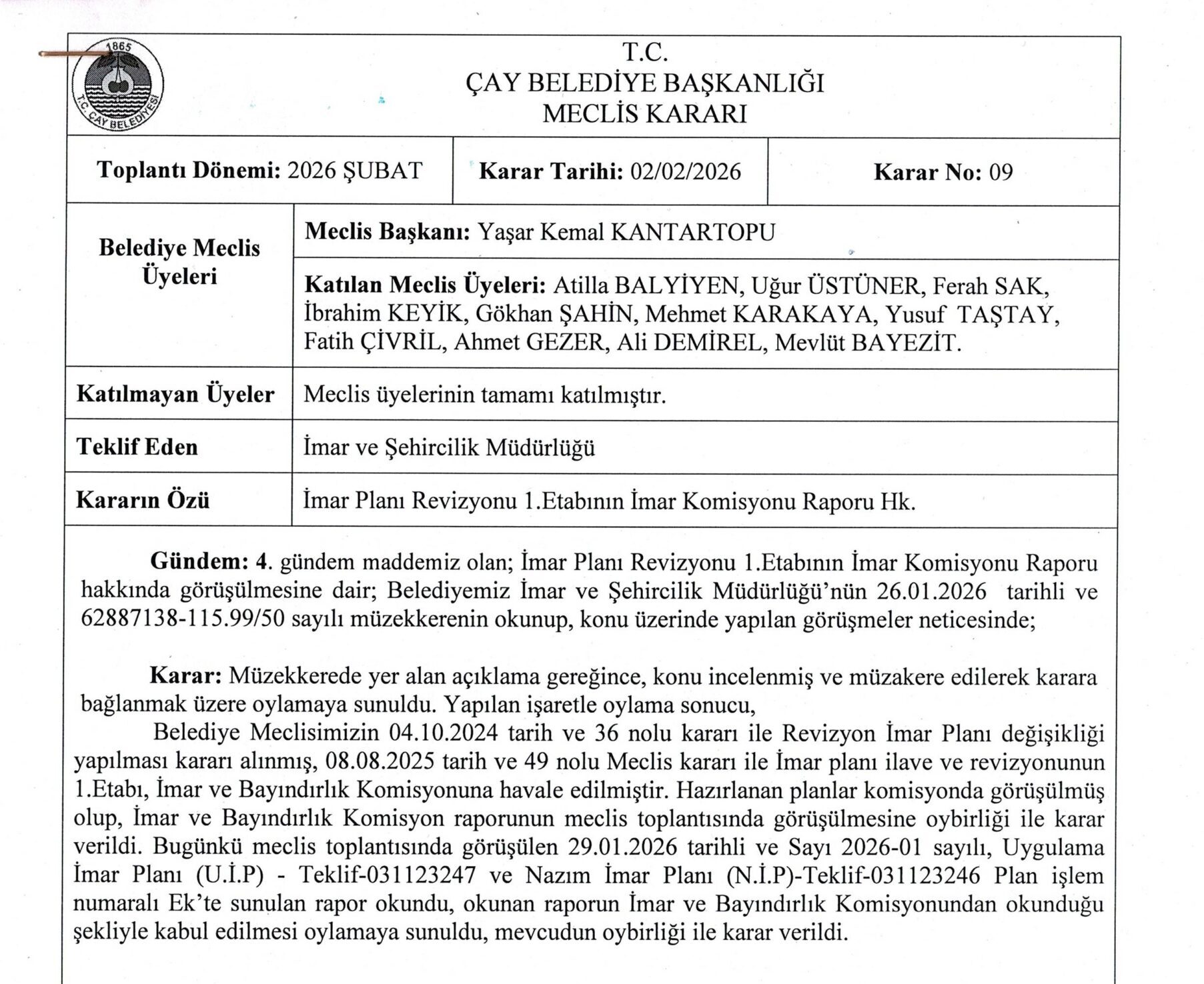 ÇAY BELEDİYESİ İLAVE REVİZYON İMAR PLANI 1. VE 2. ETABI ASKIYA ÇIKMIŞTIR